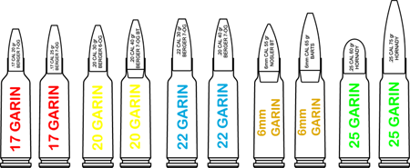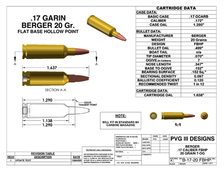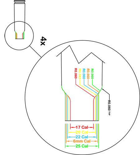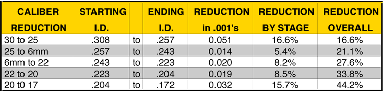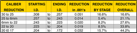 I read everything I could find on the 17 PeeWee and the 5.7mm Johnson (22 Spitfire) cartridges. I felt that both cartridges, particularly the 17 PeeWee were ahead of their times, and had suffered from a lack of appropriate components. I next laid out potential cartridge profiles in 2D AutoCad. Since it was obvious that reforming brass from 30 caliber all the way down to 17 would have to be done in several stages, it only made sense that each of these stages should yield a usable cartridge. The chart below shows the most logical progression.