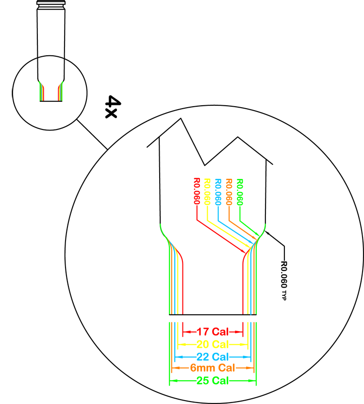 I wanted all the cartridge bodies to have the identical dimensions up to and including the shoulder. This would also allow the use of a single set of GO/NOGO gauges for all cartridges. It also yielded virtually identical internal capacities. Since the body length, shoulder angle, and overall case length were held constant in all calibers, the only variables were neck diameter and neck length. While this was not as important in the larger calibers because the shoulder was quite short, when the case was necked down to 20 and 17 caliber, a shallower angle produced an unacceptably short neck for proper bullet grip (tension). A 40° shoulder produced a good compromise, but raised a potential problem with pushing back a sharp shoulder during forming. It might also create feeding problems in repeating arms. An answer to both these concerns was found in increasing the radius of the junction between the body and the shoulder and between the shoulder and the neck to .060”. The resulting cases are easy to form with virtually no losses, and feed quite smoothly.