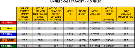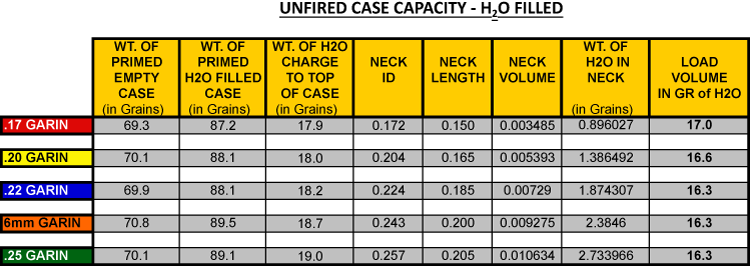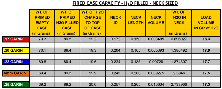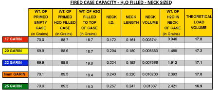 There are a number of valid ways to determine case capacity. I chose a simplified method since I felt this would allow me to do a lot of “what ifs” with good comparative data. The same process was used for both formed / unfired-formed, and formed / fire-formed cases. I first placed a fired primer in a case and weighed it dry. Next, I filled the case with water to the top of the mouth (try to get consistent menisci), and weighed wet. The total weight of water the cartridge will hold is now known. I now calculated the volume of the neck from the case mouth to the point where the neck goes tangent to the radius between the neck and the shoulder. This sounds complicated, but is an easily obtained dimension in the Cad drawings. The weight of this cylinder filled with water was now subtracted from the total weight of the filled case to yield the weight of water in Grains in the case body. I now had a good, consistent way of comparing cartridge body capacities. When final loads are being evaluated, this value can be fine tuned by adjusting the neck volume calculation to account for various seating depths.