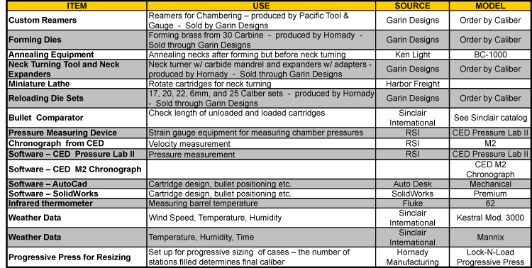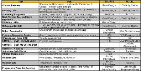 Aside from items normally found on a reloading bench, here is a list of specialty equipment I’ve accumulated during the development process. It is by no means a list of required equipment, but may be useful if you want to address specific questions. For further information on obtaining a particular item, see the vendor listing in the Resources area.